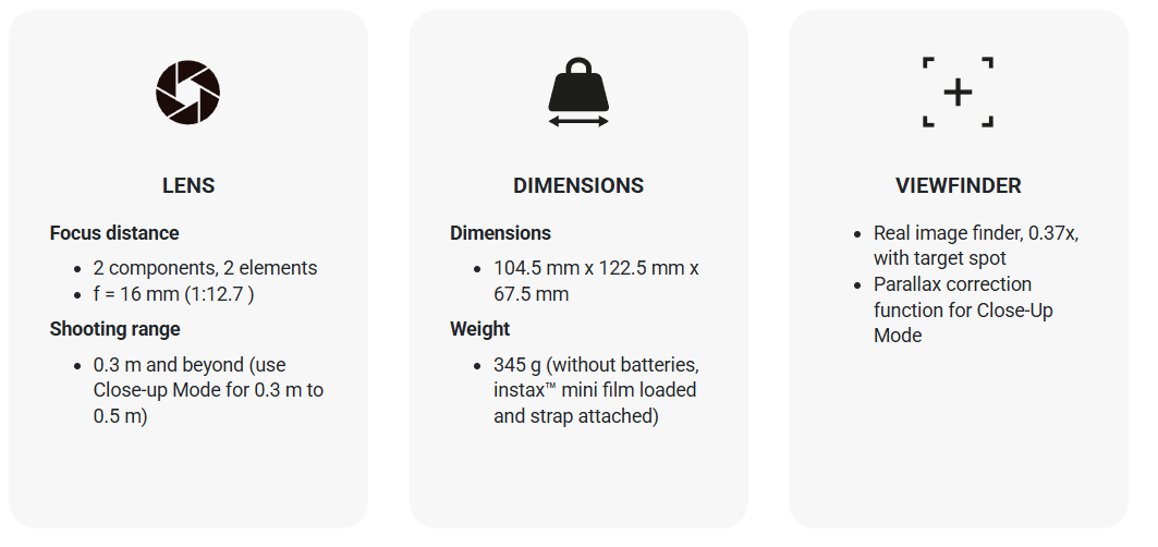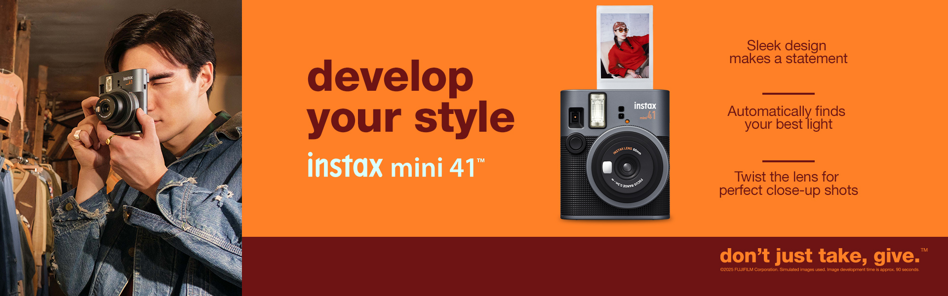 From an easy-to-operate lens design to Automatic Exposure Control that adjusts to the ambient lighting, the instax mini 41™ instant camera was built for effortless action.